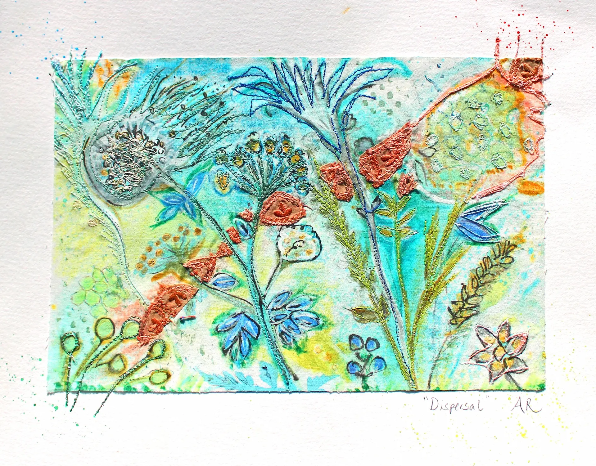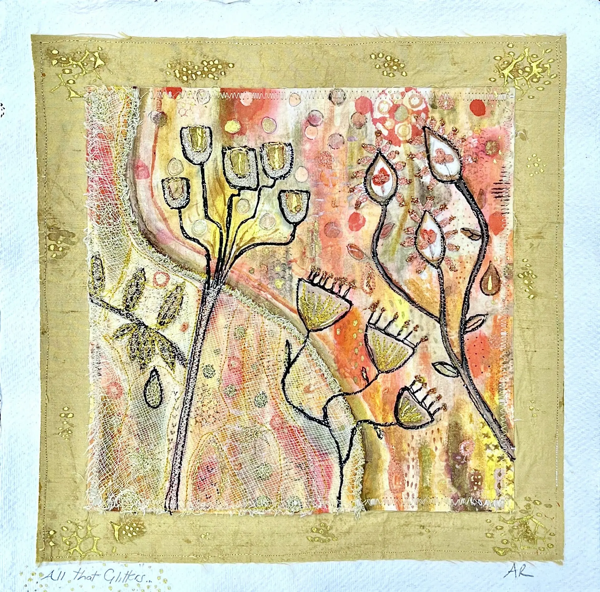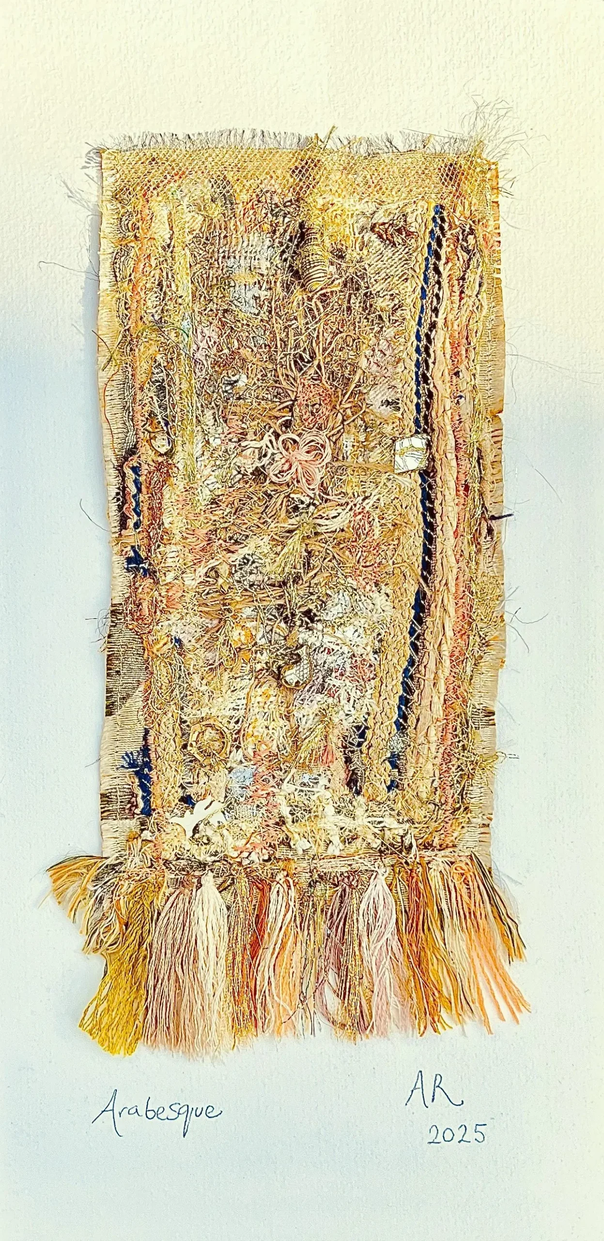 My work explores the interplay between texture, material, and memory. I create abstracts that range from richly layered fibre pieces, woven threads, tangled fabrics, stitched lines, and soft fringes to painted and stitched representations of natural forms: pods, seeds, petals, stems, leaves, and flowers. My practice is informed by a variety of influences, notably Islamic art, the Impressionists, and Klimt.