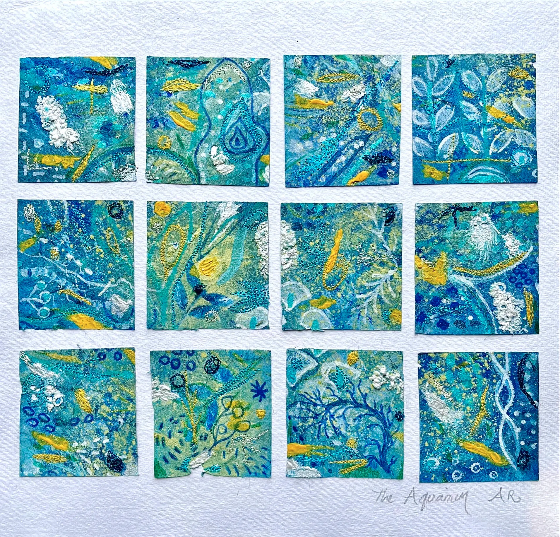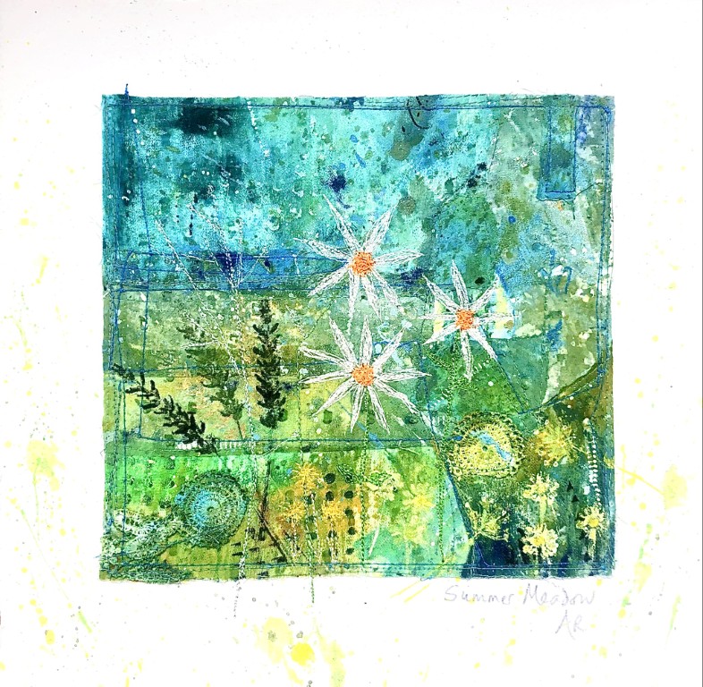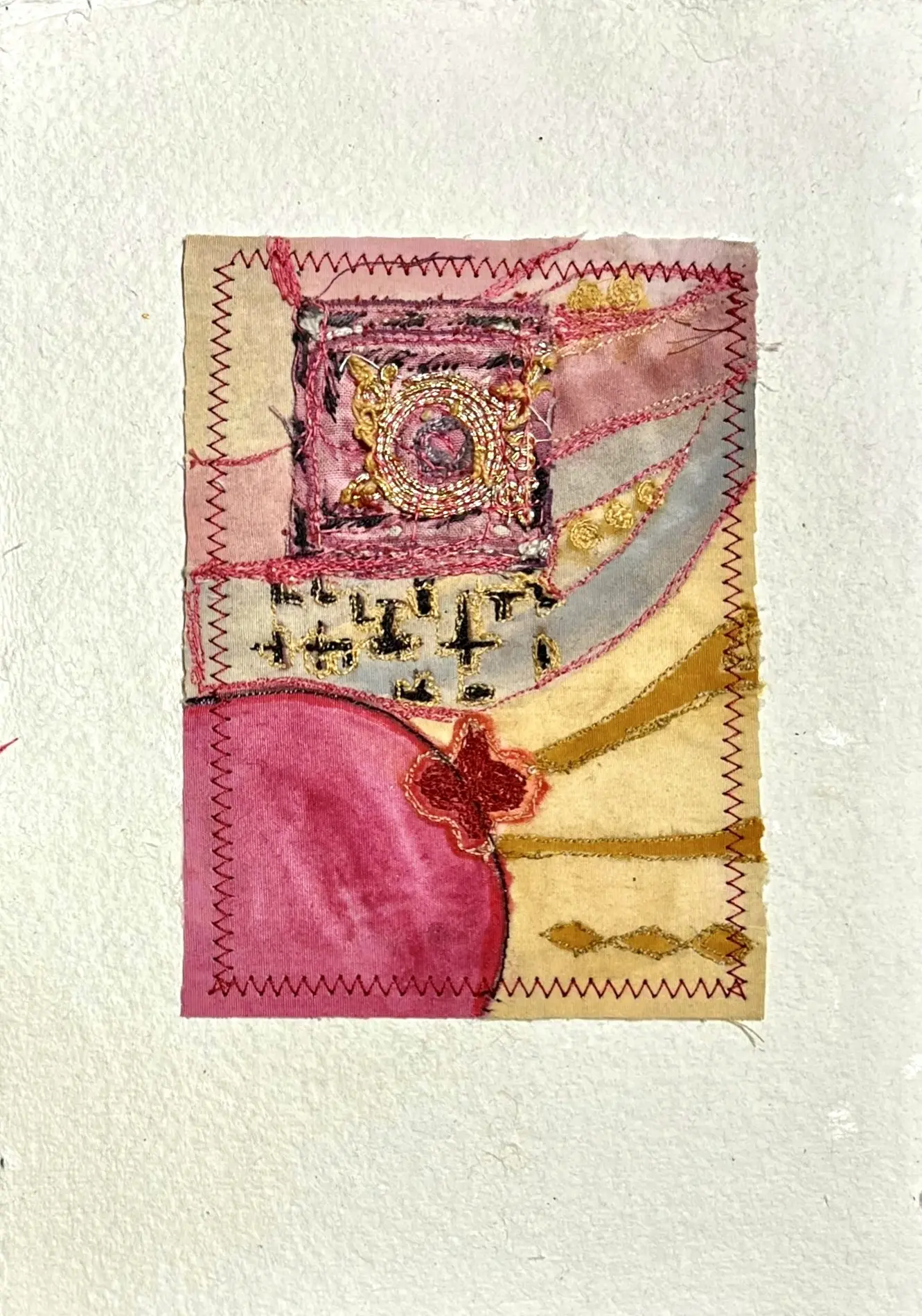 My work explores the interplay between texture, material, and memory. I create abstracts that range from richly layered fibre pieces, woven threads, tangled fabrics, stitched lines, and soft fringes to painted and stitched representations of natural forms: pods, seeds, petals, stems, leaves, and flowers. My practice is informed by a variety of influences, notably Islamic art, the Impressionists, and Klimt.