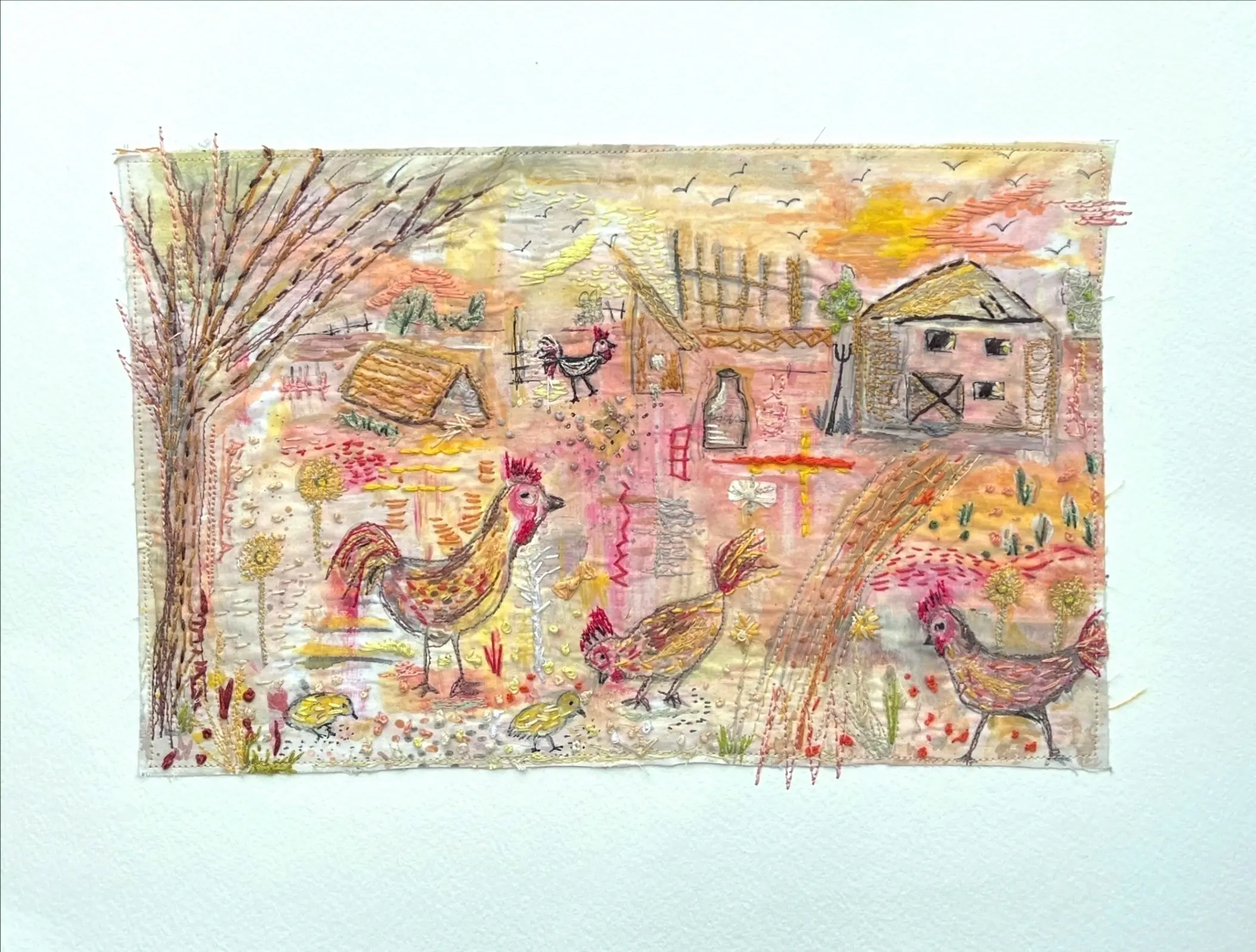 I render these birds in a naïve folk-art style, using stitched outlines and textured thread-work to give each form a tactile, dimensional presence. The backgrounds are not literal landscapes but atmospheric impressions – suggestions of light, mood and movement. Through layered marks and textile textures, I evoke watery coastal spaces of sand, surf, and seaweed, as well as the dense woodland shelters where birds might hide, nest, or wander. My intention is to create images that feel both intimate and alive, capturing the fragile character yet enduring spirit of the birds themselves.