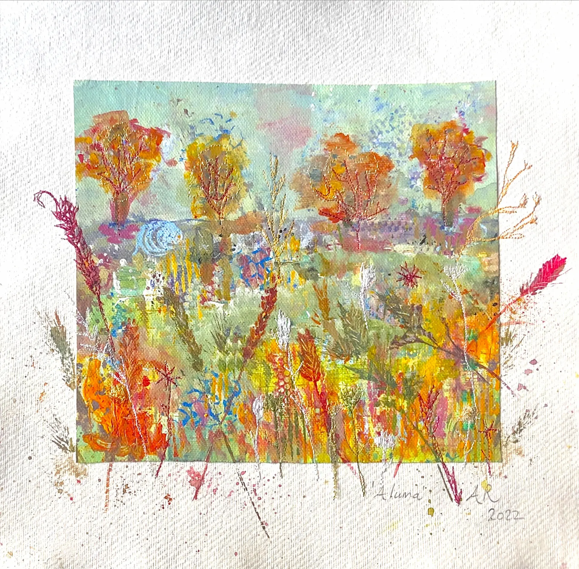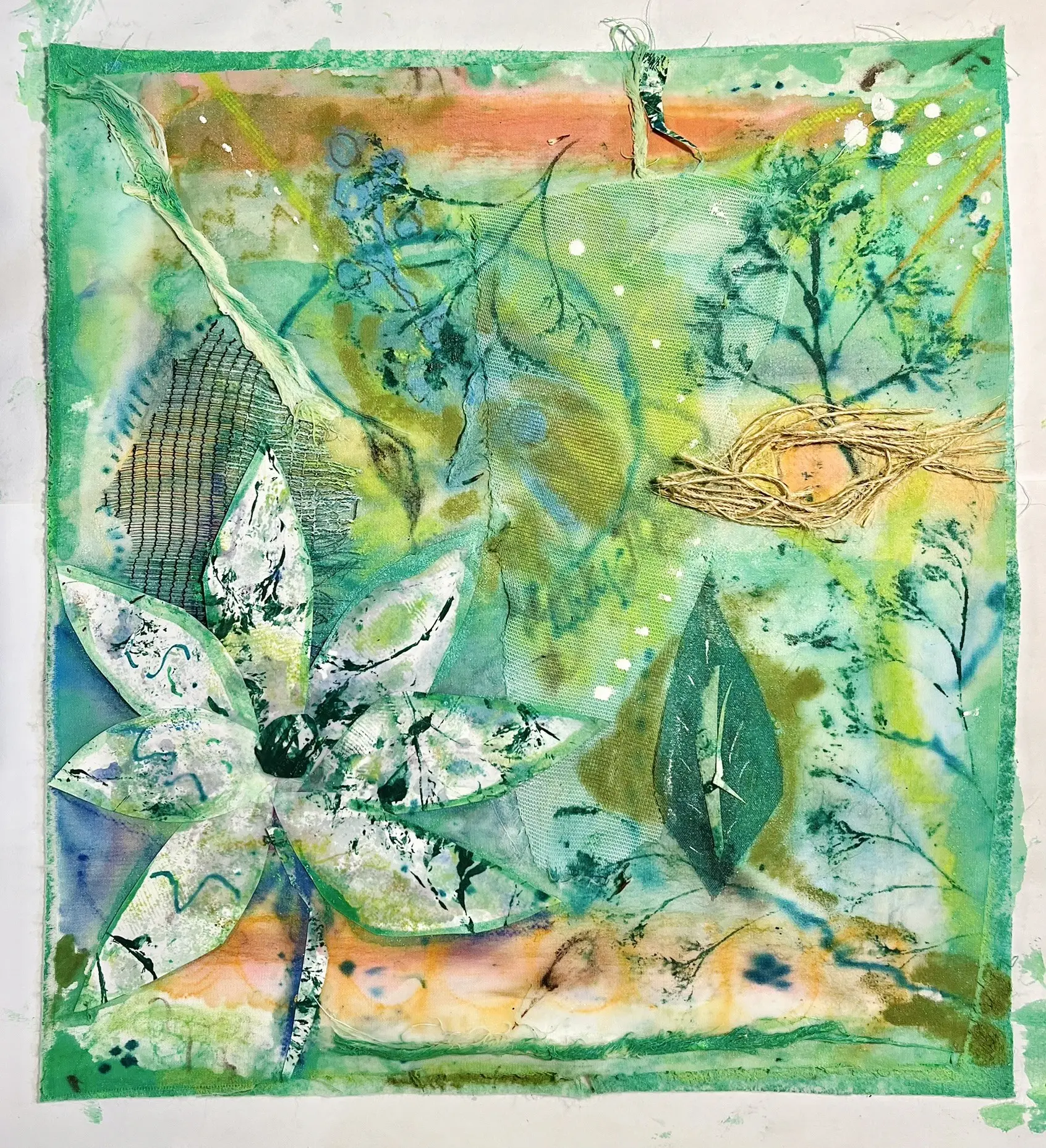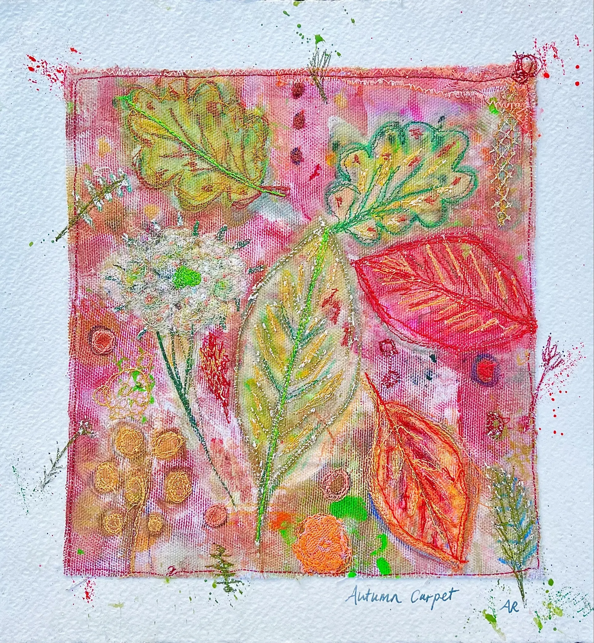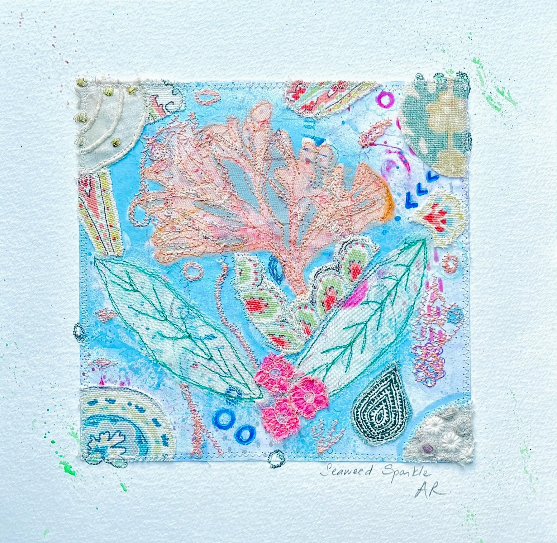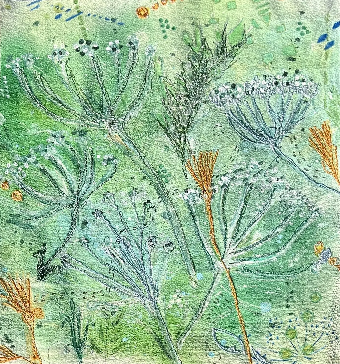 I recreate snapshots of nature through layered textiles, mixed media, and stitching. By incorporating mono-printing and appliqué, I build shapes on the surface that serve as records of time, touch, and transformation. Using mono-prints from seaweed, grasses, lavender, and leaves, I embed traces of lived experience, echoing the way personal history accumulates in quiet layers. The recurring shapes of seed pods, buds, and curling stems symbolize cycles of growth, decay, and renewal.
